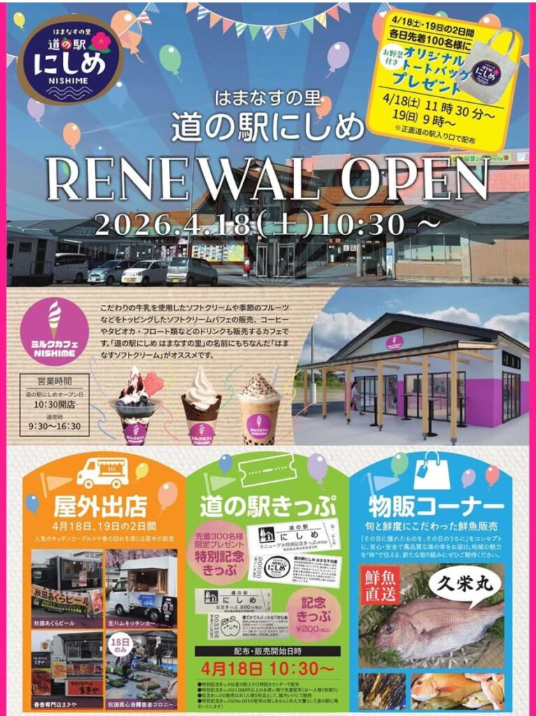4月18日、19日は道の駅にしめ(秋田県由利本荘市)リニューアルオープンに出店します。